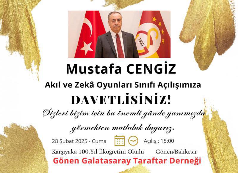Gönen’de Mustafa Cengiz İçin Anlamlı Etkinlik Galatasaray Spor Kulübü eski başkanlarından merhum Mustafa Cengiz’in adı, Balıkesir’in Gönen ilçesinde yaşatılmaya devam ediyor. Gönen Galatas...