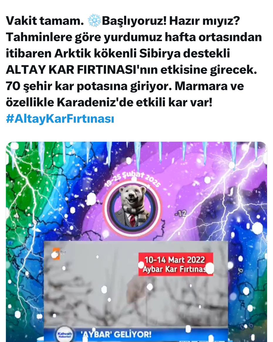 Türkiye Sibirya Kaynaklı Kar Fırtınasına Hazırlanıyor Türkiye, hafta ortasından itibaren Sibirya kökenli Altay Kar Fırtınası’nın etkisi altına girmeye hazırlanıyor. Meteoroloji, 70 şehirde kar y...