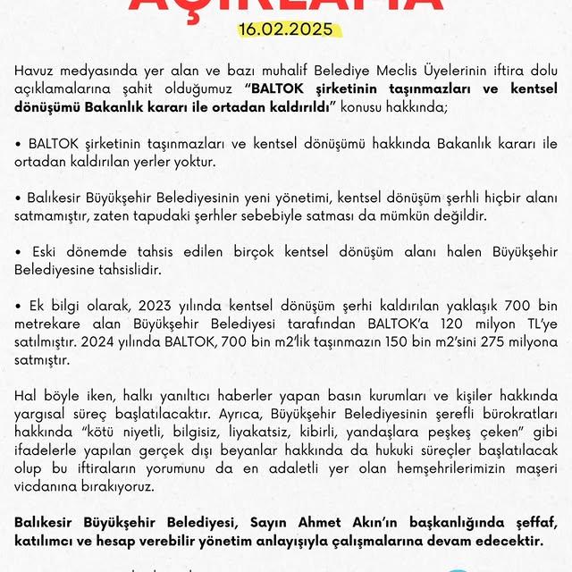 Büyükşehir Belediyesi, BALTOK Üzerine Yapılan İddiaları Yalanladı Balıkesir Büyükşehir Belediyesi, BALTOK şirketine ilişkin muhalif meclis üyelerinin iddialarına karşı açıklamada bulundu. Belediye, BA...