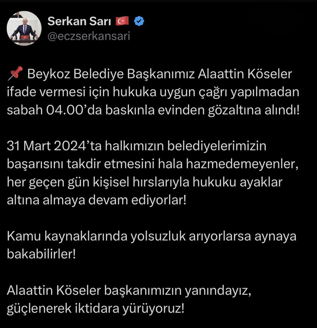 Beykoz Belediye Başkanı Alaattin Köseler’in Gözaltına Alınması Beykoz Belediye Başkanı Alaattin Köseler, 4 Ekim sabahı erken saatlerde evine düzenlenen bir baskınla gözaltına alındı. Hukuka uygu...